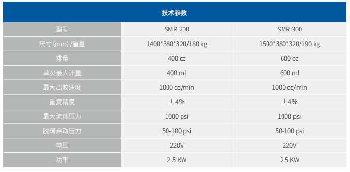 SMR-300定量机采用大容量设计结构,专为大胶量应用所设计,产品可以满足多种不同市场的应用需求, 如锂电、储能、汽车、光伏、风能等各领域。